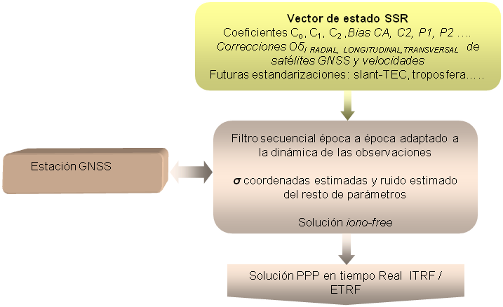 El filtro utilizado en los cálculos mostrados emplea un algoritmo secuencial ejecutado en tiempo real, en el que se puede especificar un valor σ de entrada para las coordenadas estimadas del receptor así como para el resto de parámetros del vector de estado. Tiene la ventaja de que se ajusta a la dinámica del receptor, permitiendo especificar valores de ruido para los elementos a estimar así como actualizarlos en el tiempo. Adicionalmente, no requiere gran capacidad de cálculo, si no que se ejecuta por pasos coincidentes con cada época de observación.